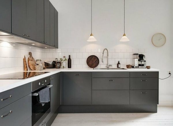 Современная серая кухня с деревянной столешницей в стиле лофт.